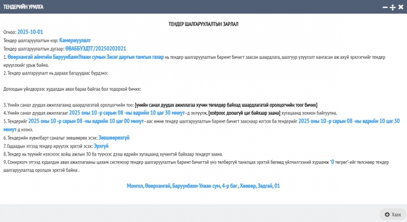 тЕНДЕРТ ОРОЛЦОХЫГ УРЬЖ БАЙНА.