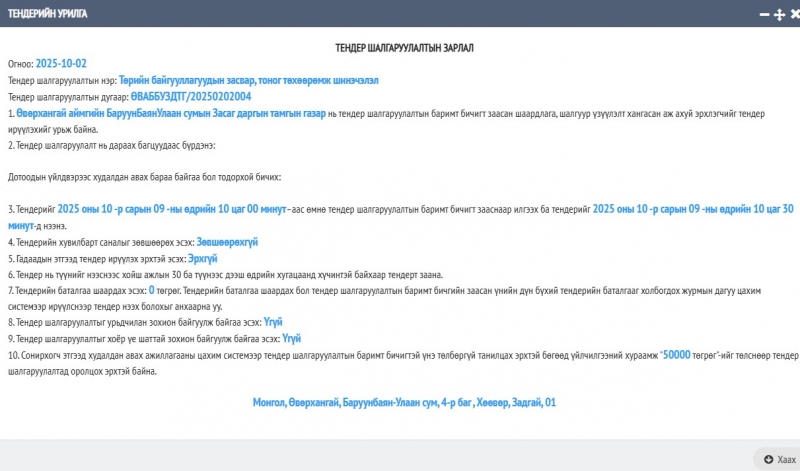 БАРУУНБАЯН-УЛААН СУМАНД ТӨРИЙН БАЙГУУЛЛАГУУДЫН ТОНОГ ТӨХӨӨРӨМЖ НИЙЛҮҮЛЭХ, КАМЕРЖУУЛАЛТЫН АЖЛУУДЫН ТЕНДЕРИЙН УРИЛГА
