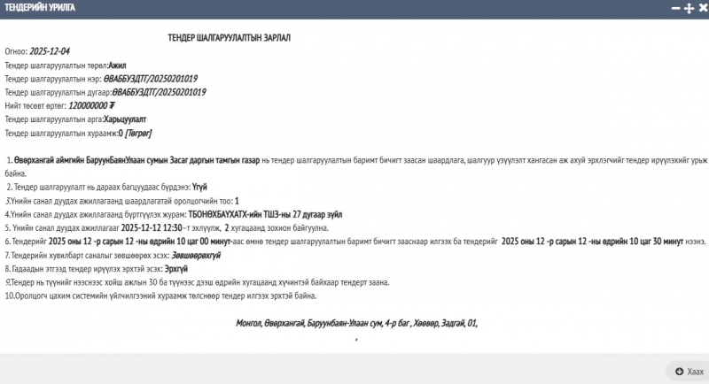Баруунбаян-Улаан сумын 2025 оны худалдан авах ажиллагааны төлөвлөгөө