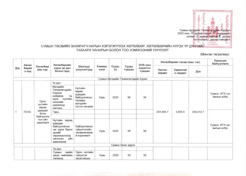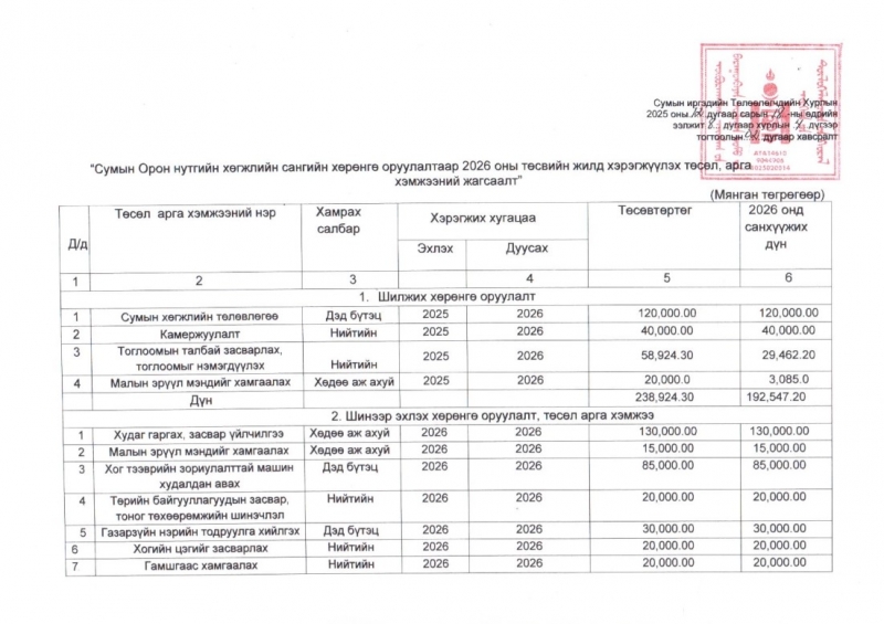 Сумын иргэдийн Төлөөлөгчдийн хурлаар актлуулахаар шийдвэрлүүлсэн хөрөнгийн жагсаалт