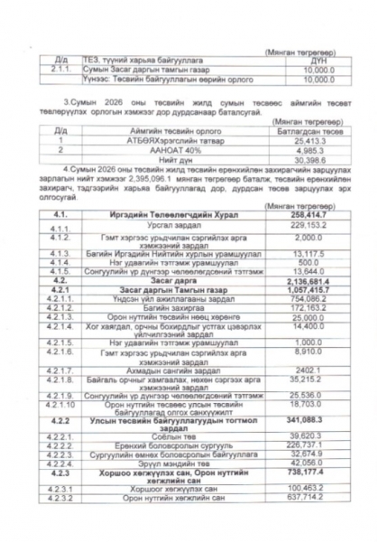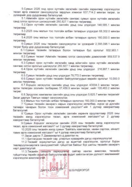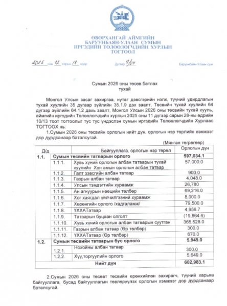 Баруунбаян-Улаан сумын 2026 оны иргэдийн Төлөөлөгчдийн хурлаар батлагдсан төсөв
